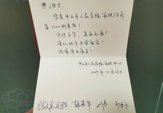 直播中接受聚焦超声消融手术的子宫肌瘤患者正好是中山市人民医院第1000例best365网站大全刀®治疗的患者,中山市人民医院best365网站大全®中心为她送上祝福卡,祝她早日康复!