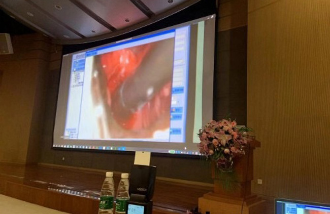 会议上,聚焦超声消融手术治疗子宫肌瘤的直播引起了与会人员的强烈兴趣。直播由中山市人民医院刘君主任在会议现场讲解,陈文直教授亲自操作一台子宫肌瘤的聚焦超声消融手术,向大家展示聚焦超声消融手术治疗子宫肌瘤的过程。从手术直播中可以直观的看到,4公分左右的肌瘤病灶在治疗过程中坏死灰度的变化,382秒完美消融。